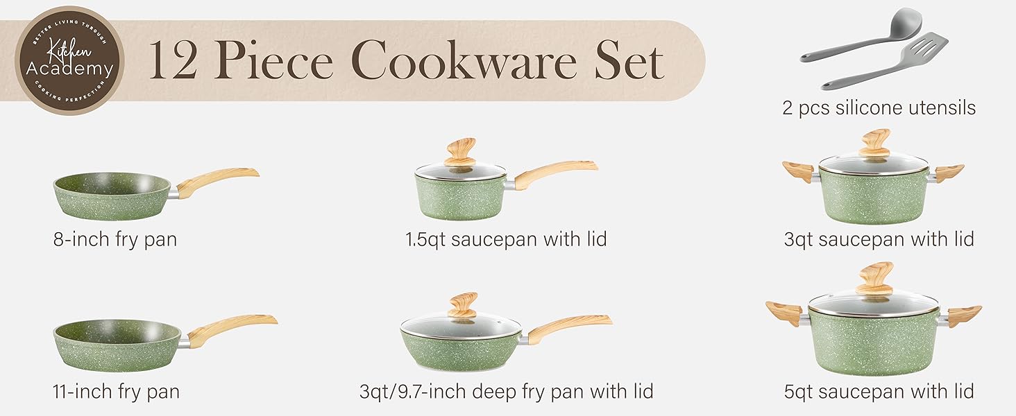 Съдържание на комплекта: Включва тиган 20 см, тиган 28 см, дълбок тиган 24,6 см с капак, тенджера 1,5 см с капак, гювеч 3 см с капак, гювеч 5 см с капак, 1 x силиконова шпатула, 1 x силиконова лъжица за готвене.
