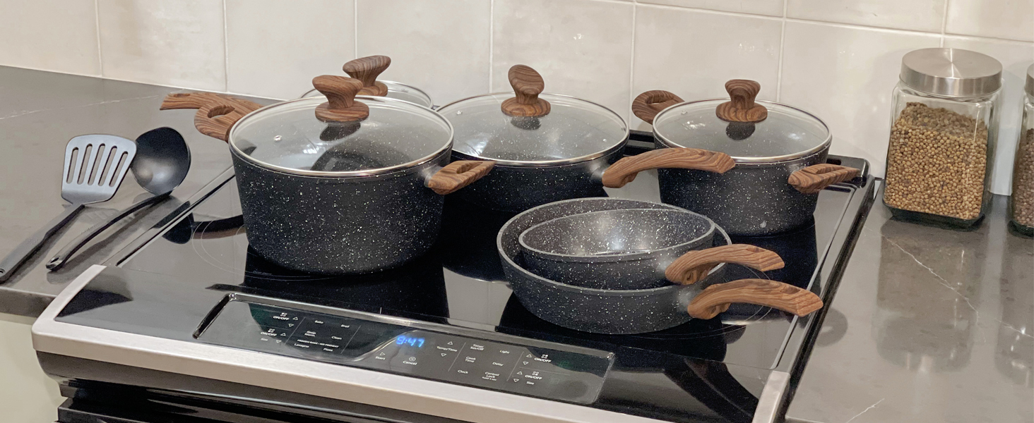 Съдържание на комплекта: Включва тиган 20 см, тиган 28 см, дълбок тиган 24,6 см с капак, тенджера 1,5 см с капак, гювеч 3 см с капак, гювеч 5 см с капак, 1 x силиконова шпатула, 1 x силиконова лъжица за готвене.