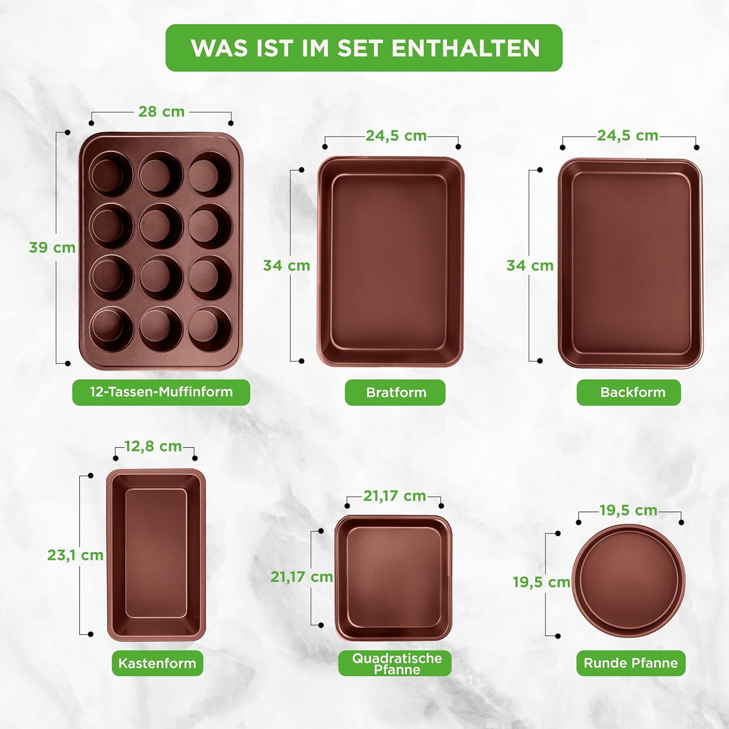 Съдържание на комплекта: (6) Комплект съдове за печене, 3 найлонови кухненски прибора, силиконова отцедка 20 см, 26 см и 30 см, отворени тигани 20 см, 26 см и 30 см, тенджери с капак 1,42 литра и 2,37 литра, гювеч с капак 4,73 литра, 2 години гаранция, тиган за скара 4 см, черпак за супа, вилица за паста и шпатула. Всичко необходимо, за да приготвите всяка рецепта перфектно!