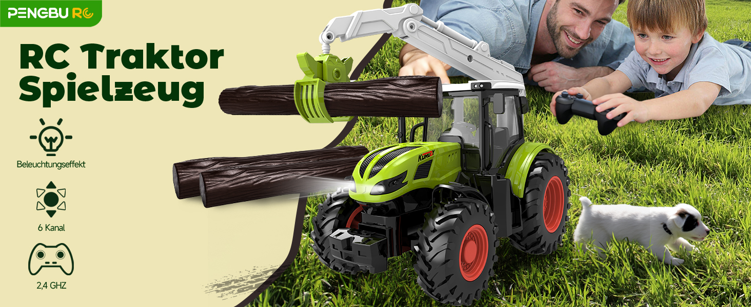 Realistic remote controlled tractor for children: the remote controlled tractor toy has a beautiful look with simulated seat, steering wheel and control console. The farm toy can be moved forward/back and steered left/right. The lights can be opened/closed by simply pressing a button. This is a 2.4 GHz RC tractor: automatic pairing, good anti-jamming ability. Suitable for multiple tractor toys at the same time without interference.