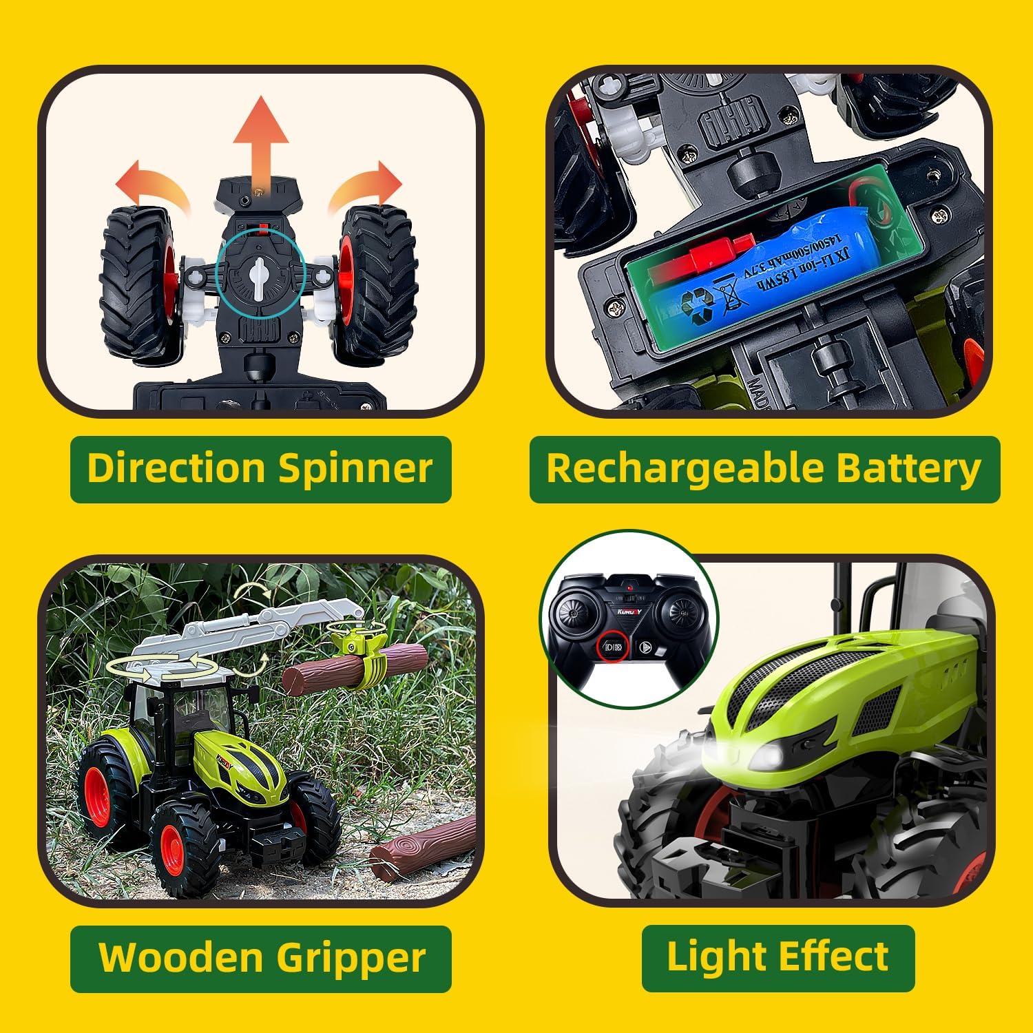 Realistic remote controlled tractor for children: the remote controlled tractor toy has a beautiful look with simulated seat, steering wheel and control console. The farm toy can be moved forward/back and steered left/right. The lights can be opened/closed by simply pressing a button. This is a 2.4 GHz RC tractor: automatic pairing, good anti-jamming ability. Suitable for multiple tractor toys at the same time without interference.