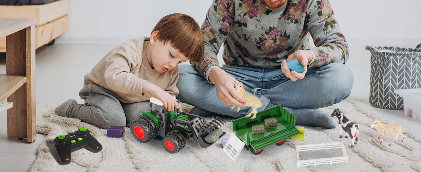 Realistic details: this tractor toy from 3 years is a replica of a real tractor. From the cockpit seat to the steering wheel to the control panel, each part is designed to look like a real tractor. The tractor toy from 4 years is equipped with an adjustable loading arm and a tilting trailer to bring variety to the game. The cows and sheep are also impressively lifelike. Overall, this remote controlled tractor not only educates and inspires children, but also offers a realistic playing experience.