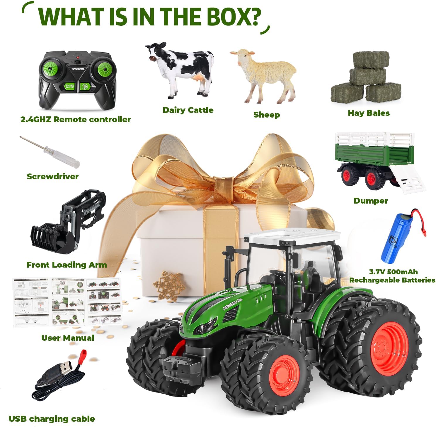 Realistic details: this tractor toy from 3 years is a replica of a real tractor. From the cockpit seat to the steering wheel to the control panel, each part is designed to look like a real tractor. The tractor toy from 4 years is equipped with an adjustable loading arm and a tilting trailer to bring variety to the game. The cows and sheep are also impressively lifelike. Overall, this remote controlled tractor not only educates and inspires children, but also offers a realistic playing experience.