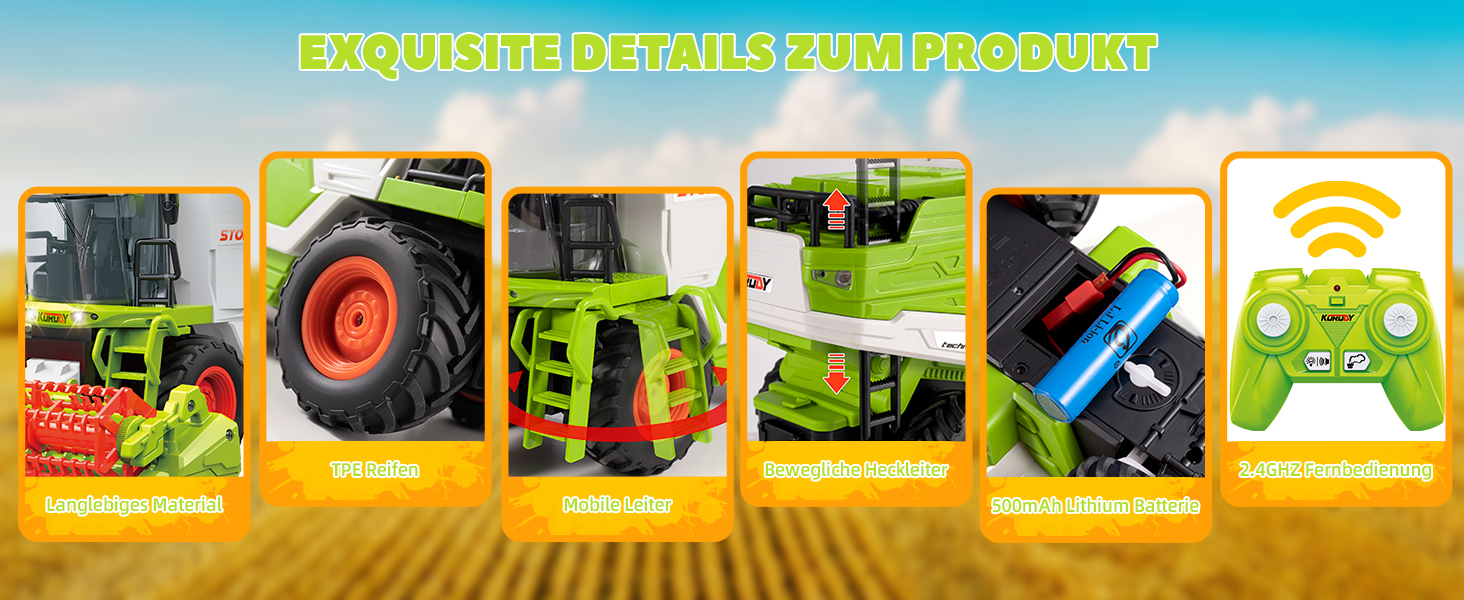 Combine harvester toy with high stability: replica of the real scale, the design of the remote controlled combine harvester body is robust, stable and resistant to falls. The body is made of high quality light-resistant ABS plastic, no glue or screws and has vacuum tyres made of TPE material with good rolling performance.