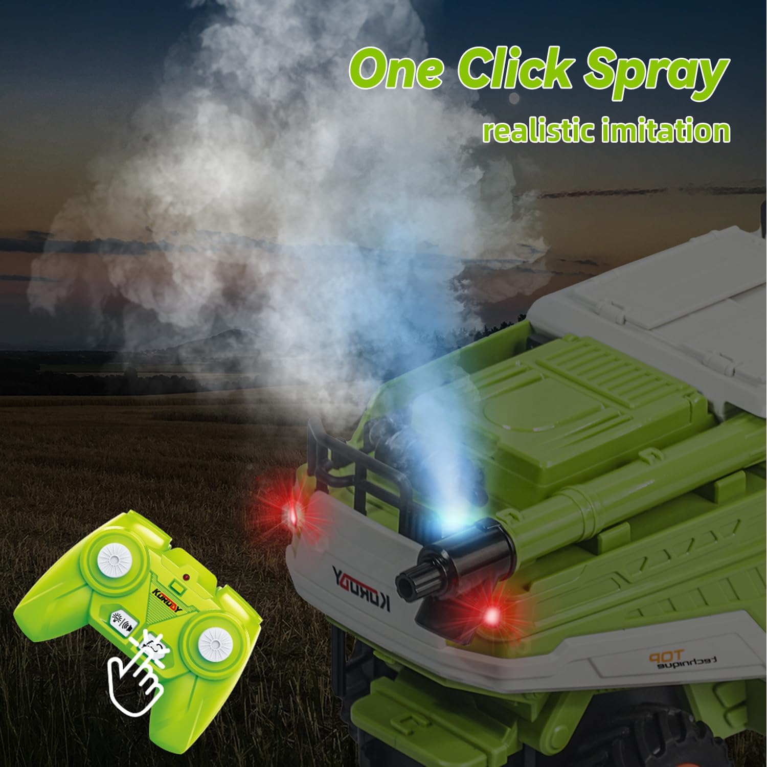 Hexagonal combine toy: 2.4 GHz one-button remote control that can realise forward, backward, left, right, sound and light control as well as smoke control. The buttons of the RC combine harvester are simple and easy to use and increase the fun of the game. When the combine harvester toy works at night, the light mode is activated, and the reversing lights are automatically switched on when reversing, which comes closer to the real agricultural scene.