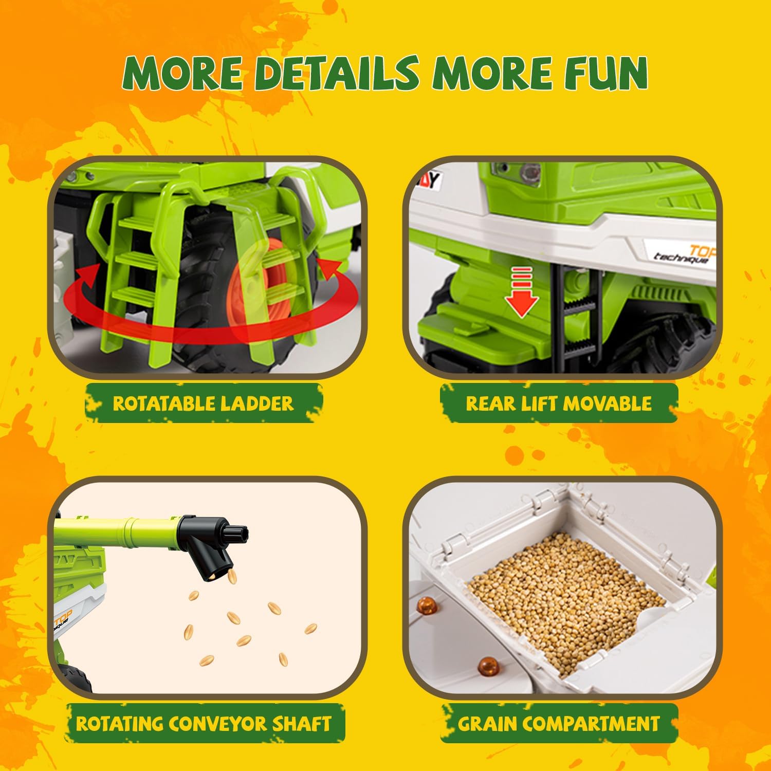 Combine harvester toy with high stability: replica of the real scale, the design of the remote controlled combine harvester body is robust, stable and resistant to falls. The body is made of high quality light-resistant ABS plastic, no glue or screws and has vacuum tyres made of TPE material with good rolling performance.