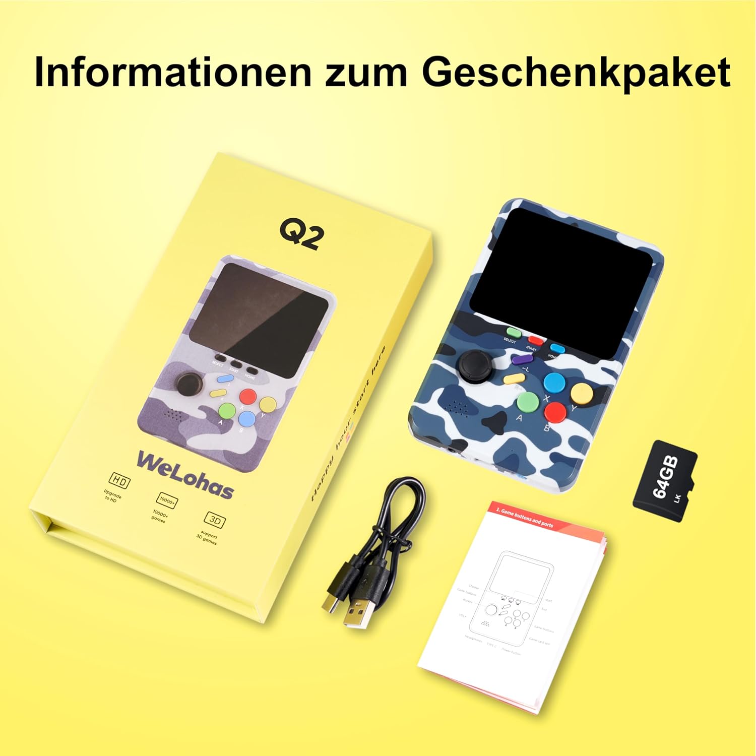 / WeLohas Q2 Ретро ръчна конзола за игри 10 000+ видеоигри 64GB 3 инчов HD екран Blue